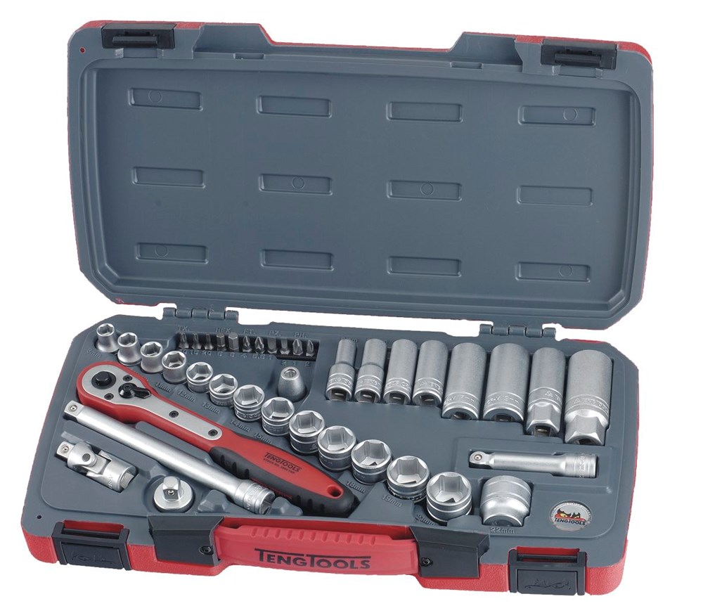 39-delige doppenset 3/8" in een kunststofkoffer met dubbel klikslot.