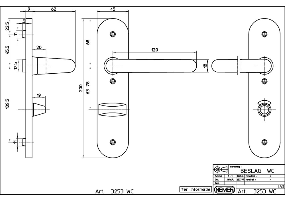 3253 WC 63MM RS BESLAG KORTSCHILD AFGEROND, D KRUK-KRUK, BESLAGSET, GEVEERD, KRUKSTIFT 8MM, F1 ALUMINIUM, WC63, DRAAIRICHTING RECHTS
