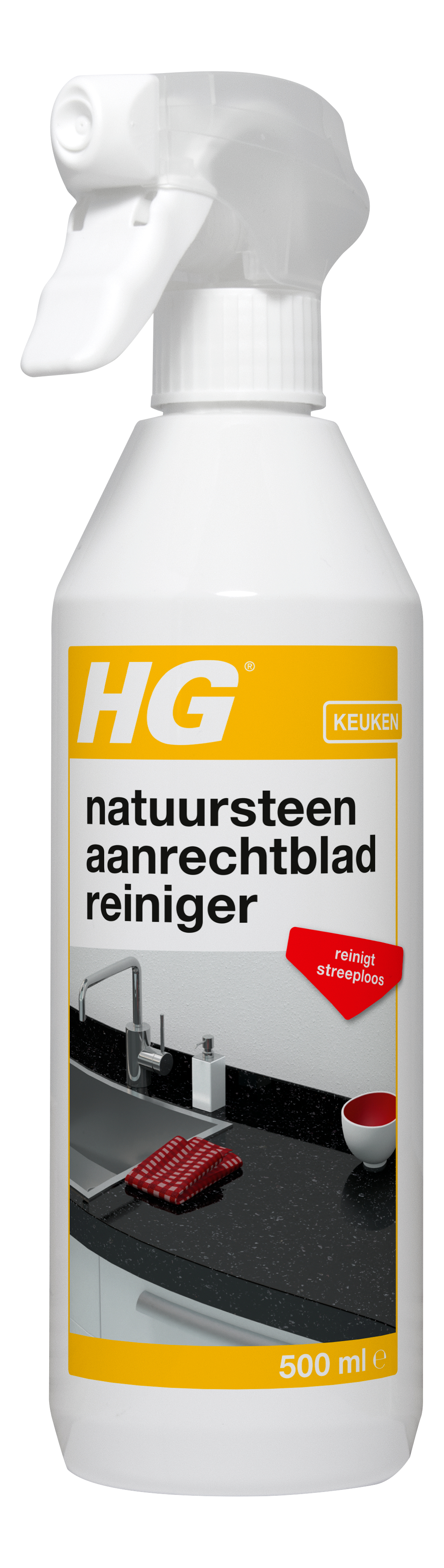 HG natuurstenen aanrechtbladreiniger is speciaal ontwikkeld voor een snelle, streeploze en veilige dagelijkse reiniging van aanrechtbladen van graniet, marmer, hardsteen en andere natuursteensoorten. Dit product verwijdert effectief vet en andere vervuiling en zorgt voor een streeploos resultaat zonder nawrijven. Bovendien geeft deze speciale formule structuurverdieping waardoor uw aanrecht elke dag weer z’n natuurlijke eigenschappen uitstraalt. Het te reinigen oppervlak inspuiten met HG aanrechtbladreiniger en vervolgens met een schoon (aanrecht)doekje het oppervlak afnemen. Bij hardnekkig, ingedroogd vuil het product een paar minuten laten inwerken. 500 ML